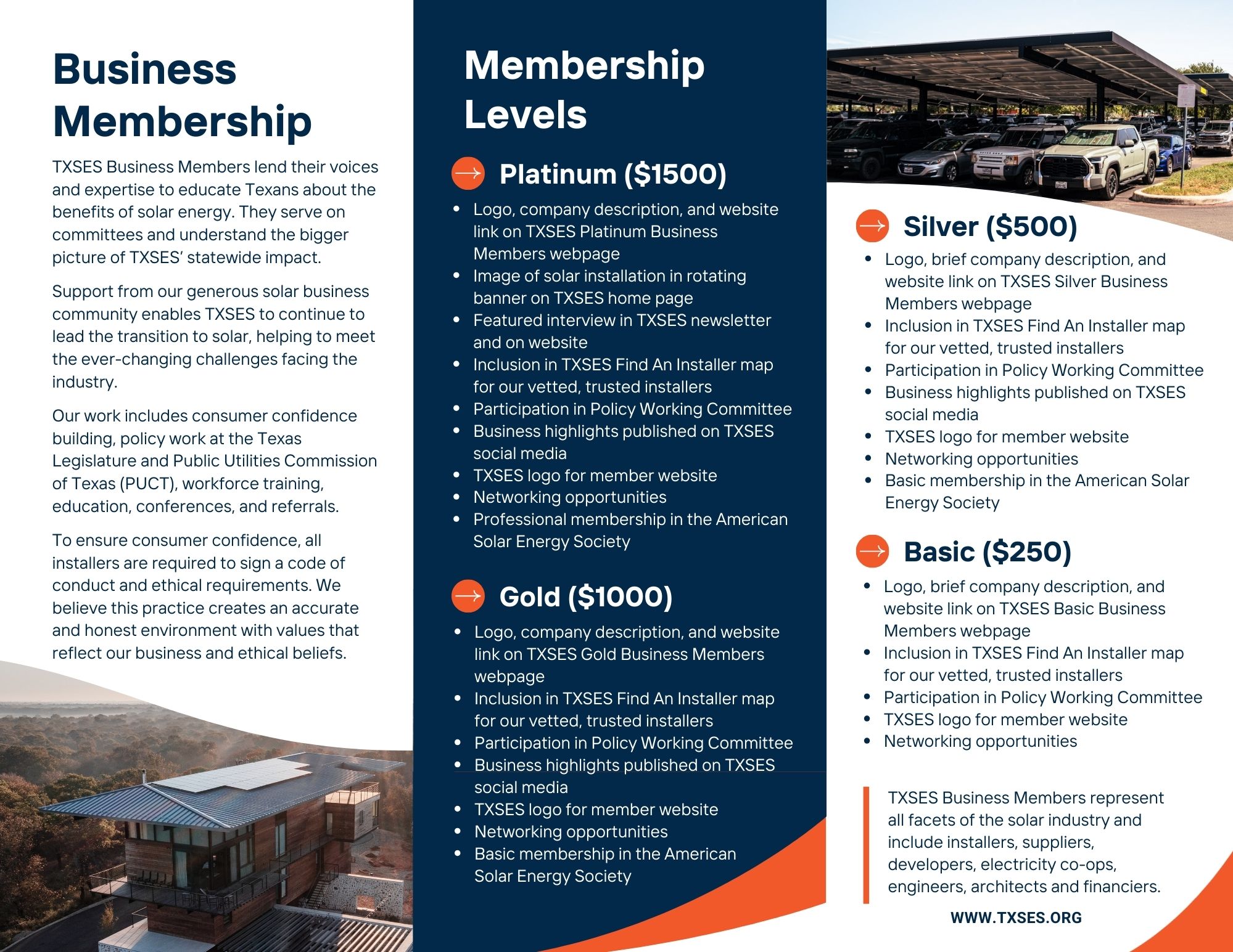 Our different levels of business memberships are an integral part of TXSES’ overall mission. Business Members lend their voices and expertise in educating Texans about the benefits of solar energy, separating fact from fiction. They serve on committees, are a strong presence at fundraising events, and understand the bigger, more complete picture of TXSES’ statewide impact. Support from our generous solar business community enables TXSES to continue to lead the transition to a solar energy reality, helping them meet the ever-changing challenges facing the industry.