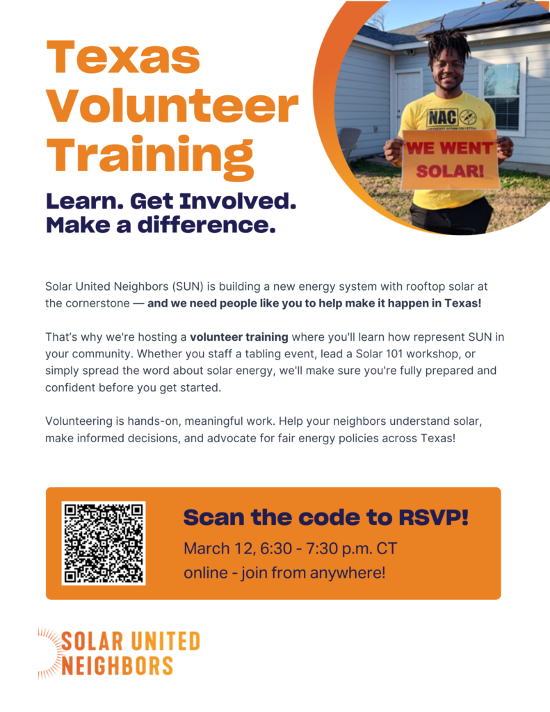 Have you wanted to get involved with advocating for, and talking about solar, but not sure how to get started? Join Solar United Neighbors (SUN) for their Texas volunteer program to learn more about SUN, what they do in Texas, and how you can help.